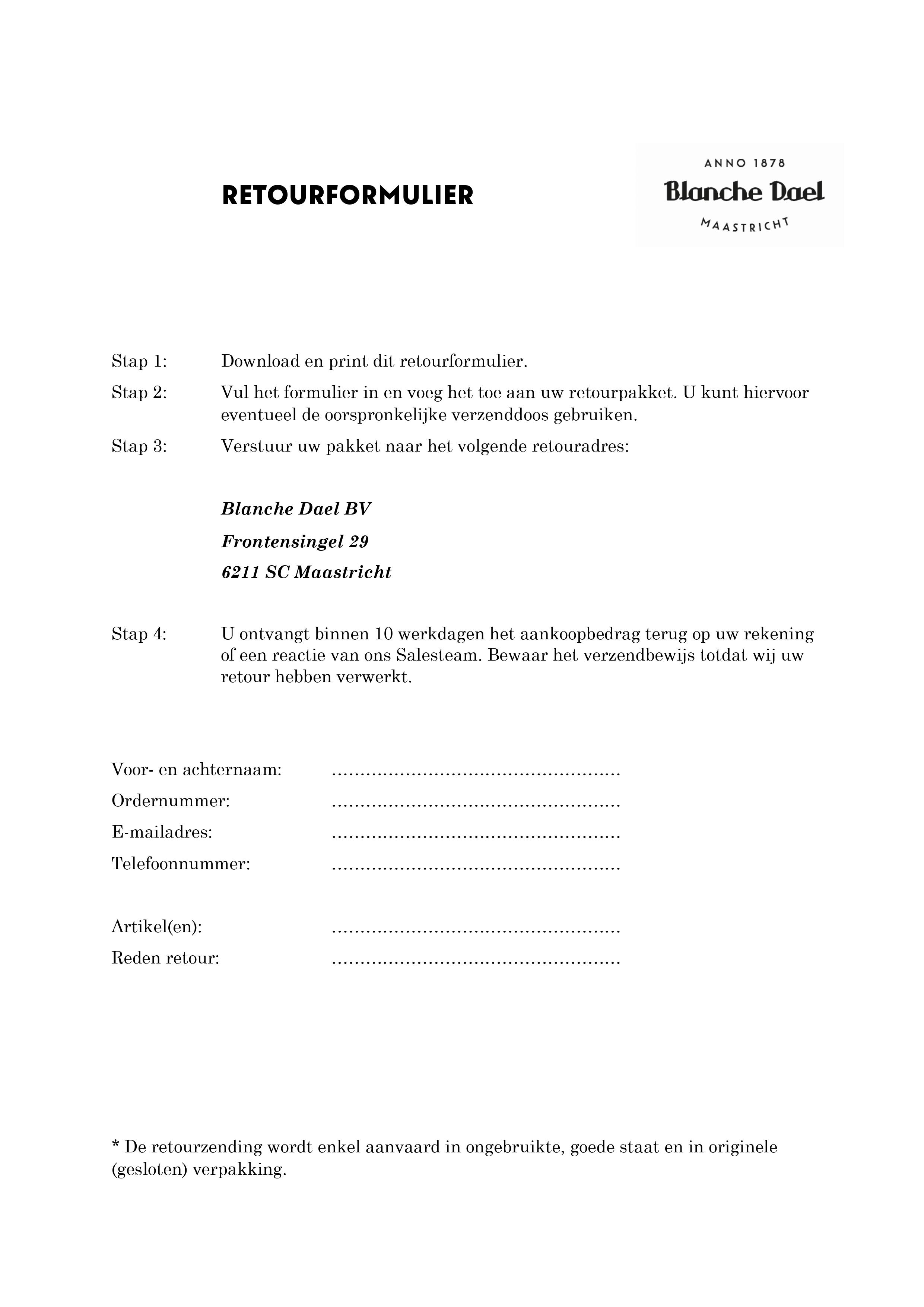 *De retourzending wordt enkel aanvaard in ongebruikte, goede staat en in originele (gesloten) verpakking. Wij kunnen geen retourzendingen zonder retourformulier verwerken.