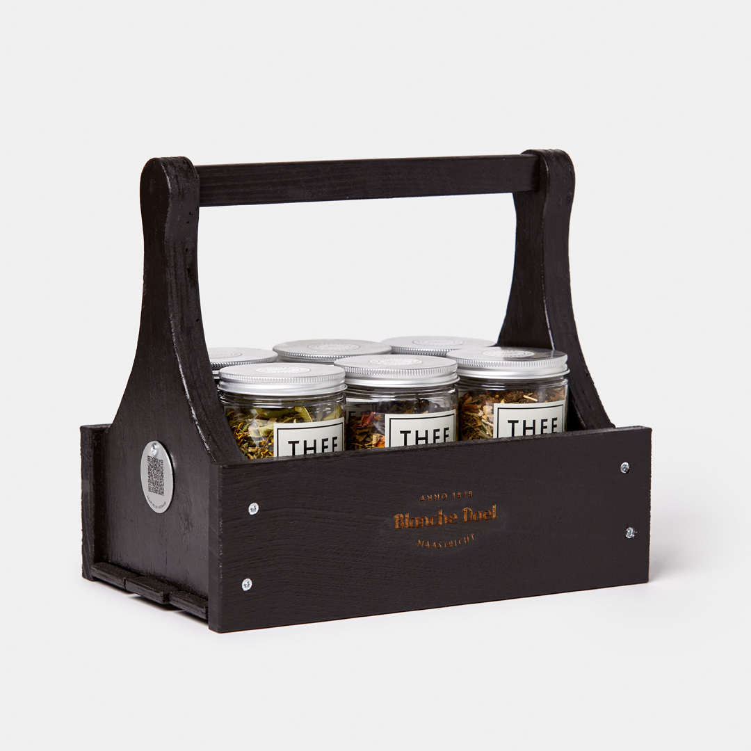 In dit houten theerek kunnen 6 Blanche Dael plastic voorraadpotjes worden geplaatst.