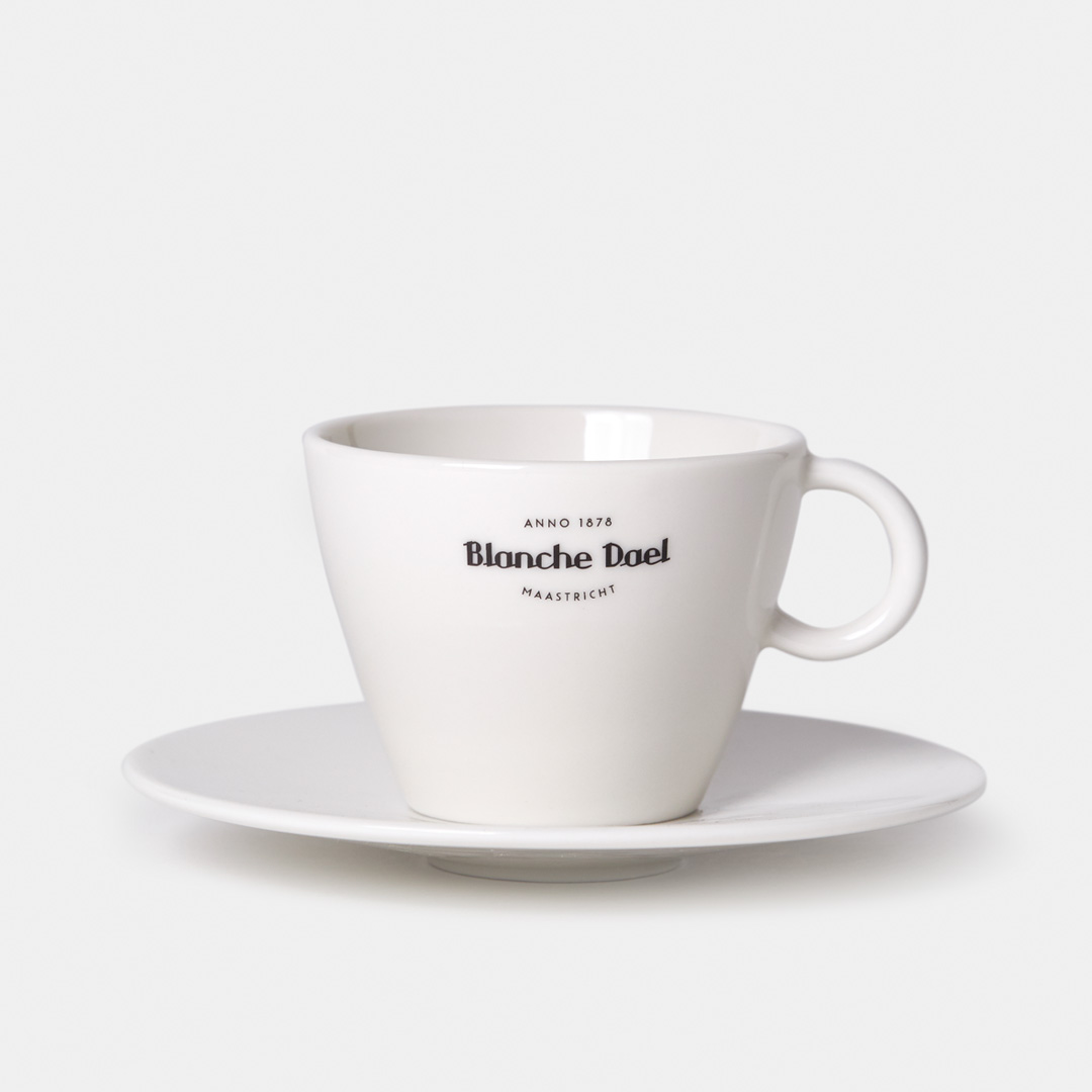 Dek uw tafel met het nieuwe stijlvolle Blanche Dael servies, bestaande uit vijf kopjes: lungo, cappuccino, espresso, thee én een grote mok voor een grote koffie of chocomel. De kopjes hebben één maat schotel, zodat u eindeloos kunt combineren. Het nieuwe Blanche Dael porselein is ontworpen door de architect van onze nieuwe branderij: Josef Bischofs. Het porselein is geproduceerd door Raja Europe in Maastricht.