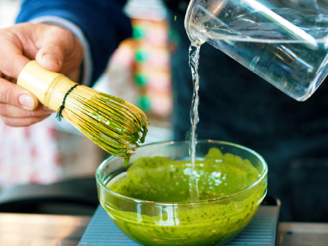 - Klop met de bamboe Matcha Klopper (chasen) in een zigzag-beweging tot er een egale schuimlaag ontstaat.